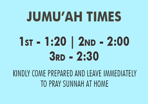 | Jumuah | 1:20 pm | 2:00 pm | 2:30 pm | |
